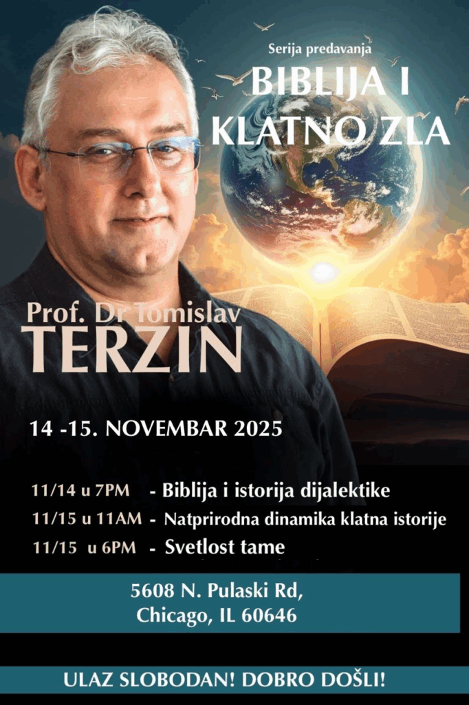 Hrišćanska Adventistička crkva Vas poziva na izuzetno zanimljivu seriju predavanja pod nazivom „Biblija i klatno zla“, koju će održati prof. dr Tomislav Terzin, poznati naučnik i teolog. Predavanja će se održati 14. i 15. novembra 2025. godine.