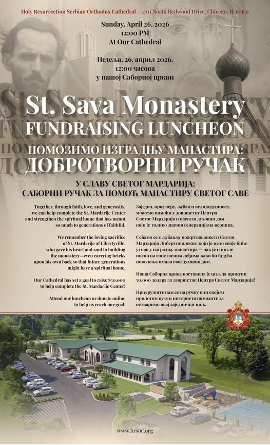 Saborni ručak za pomoć manastiru Svetog Save. Udružimo snage kako bismo, kroz veru i ljubav, dovršili izgradnju Centra Svetog Mardarija – duhovnog doma koji decenijama okuplja naše generacije.