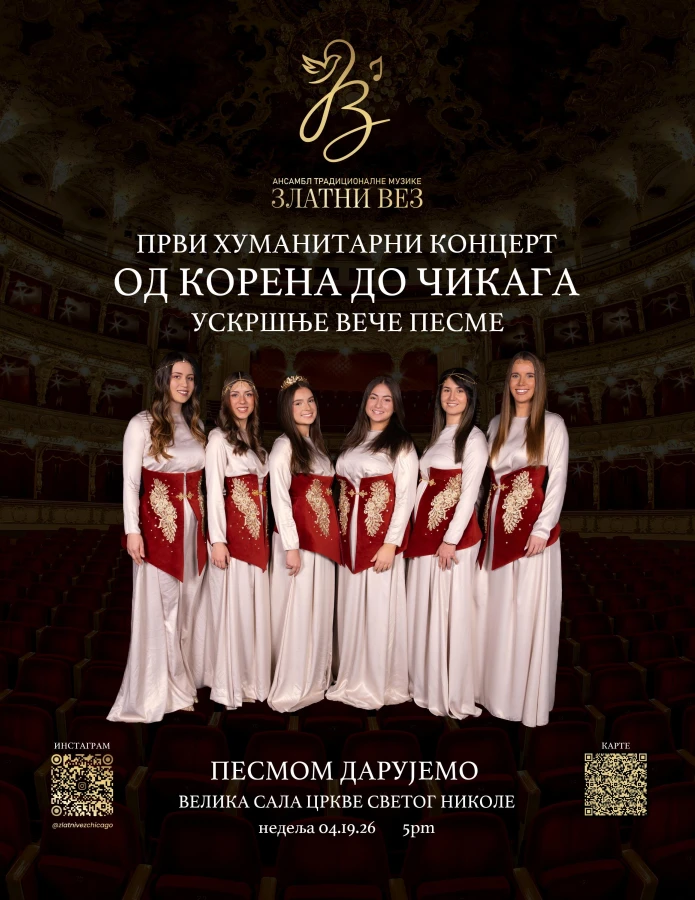 Ansambl tradicionalne muzike „Zlatni Vez” sa ponosom Vas poziva na svoj prvi samostalni koncert u Čikagu. Pridružite im se na večeri koja slavi bogatstvo balkanske muzike, tradiciju i dobročinstvo.