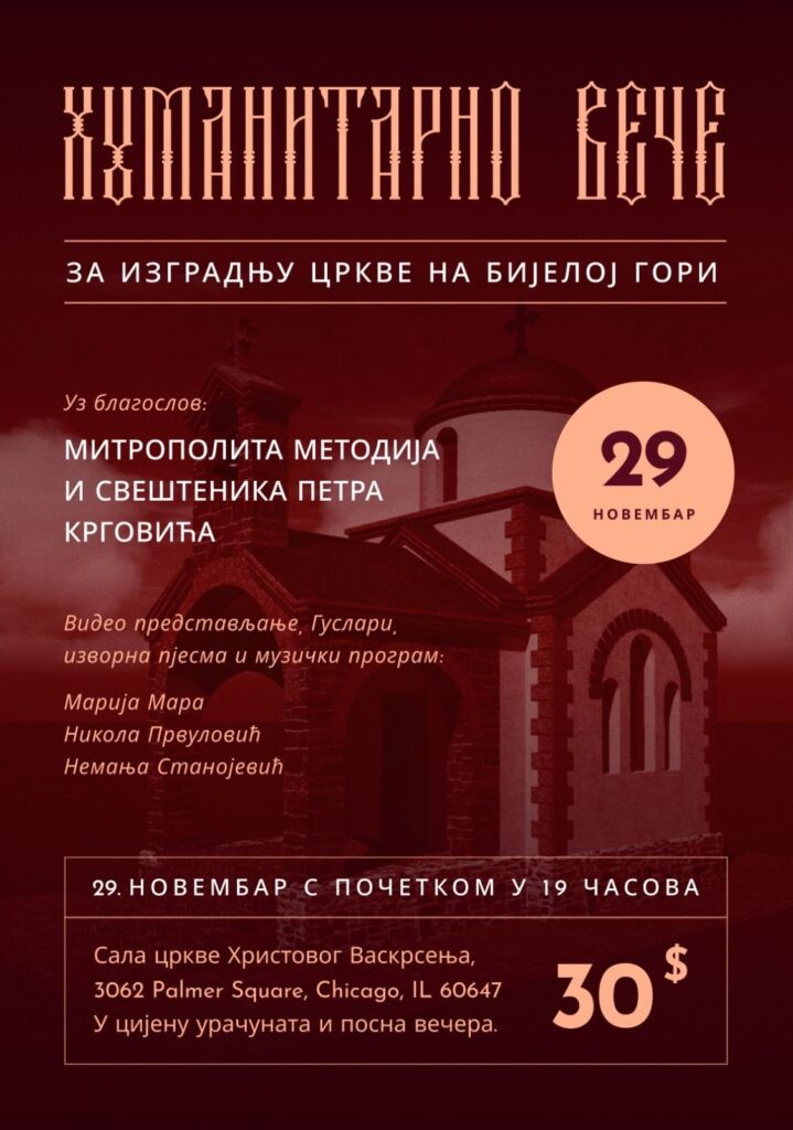 Pod blagoslovom Mitropolita Metodija i Sveštenika Petra Krgovića, Crkva Hristovog Vaskrsenja Vas poziva na humanitarno veče posvećeno prikupljanju sredstava za izgradnju crkve na Bijeloj Gori.