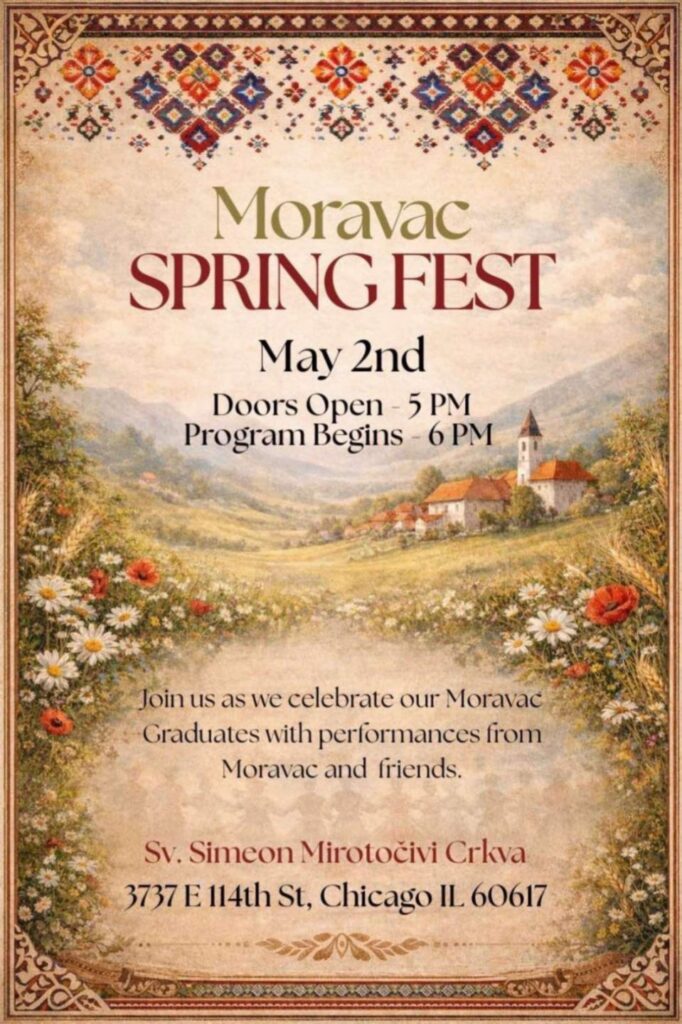 - Event Tags:2. maj, 2026, america, amerika, ansambl Moravac, chicago, crkva sv simeona, crkva Sveti Simeon Mirotočivi, decembar, dijaspora, folklorna smotra, illinois, Moravac Spring Fest, nesa castelo, prolećni festival, proslava maturanata, srpska kultura u Americi, srpska zajednica Čikago, srpski događaji Čikago, srpski folklor Čikago, tradicionalna igra, us, usa