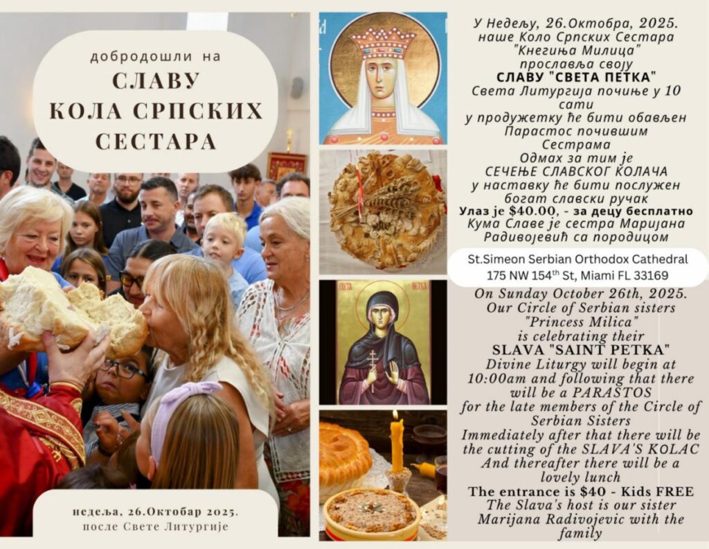 U nedelju, 26. oktobra 2025. godine, prisustvujete svečanom obeležavanju slave Sveta Petka, koju tradicionalno proslavlja Kolo srpskih sestara „Kneginja Milica“ pri hramu St. Simeon Serbian Orthodox Cathedral u Majamiju.