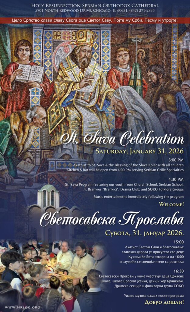 Lokacija: Saborni hram Vaskrsenja Hristovog (Holy Resurrection Serbian Orthodox Cathedral) 5701 North Redwood Drive, Chicago, IL 60631